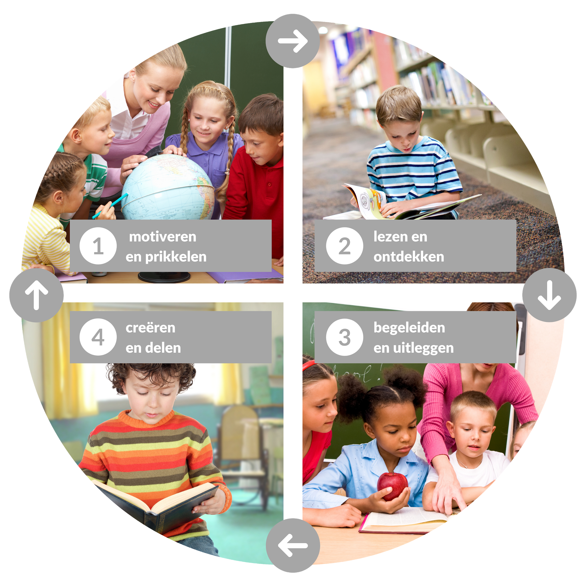 Lezen start bij prikkelen en motiveren. Om geprikkeld te raken, is het belangrijk dat leerlingen boeiende teksten en boeken tegenkomen. Als de interesse is gewekt, ontstaan informatieve vragen en leesdoelen meestal vanzelf. Vaak hebben deze te maken met de wereld om ons heen. We willen dingen weten en lezen is een belangrijke manier om dit voor elkaar te krijgen.